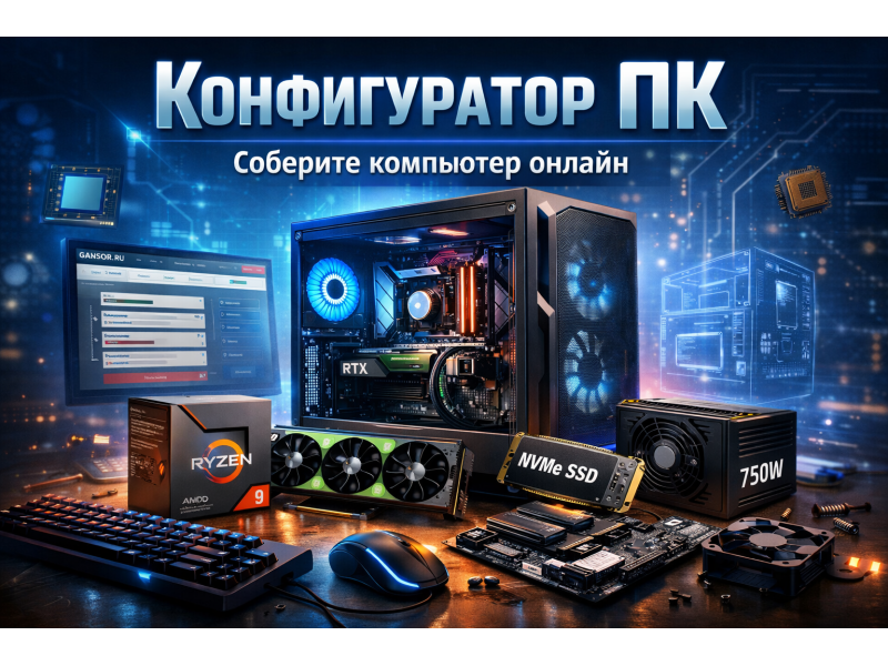 Конфигуратор — это онлайн-инструмент на GANSOR.RU, который позволяет самостоятельно выбрать все комплектующие будущего компьютера: процессор, видеокарту, память, накопитель, материнскую плату, блок питания и корпус. Система автоматически проверяет совместимость компонентов и показывает итоговую стоимость. Мы запустили его, потому что получали много запросов от покупателей, которые хотели сами управлять процессом подбора.